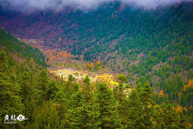 刚下缆车就从上空观看整个黄龙景区,要走到那里还需要大概45分钟的路程。从缆车到达处走到黄龙的路上是有点闷的,因为路上都是原始森林都是树木,期间没有什么风景。