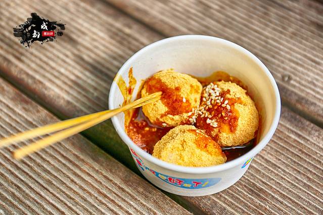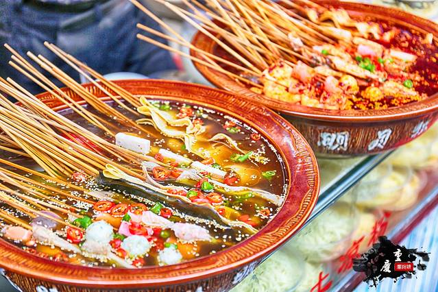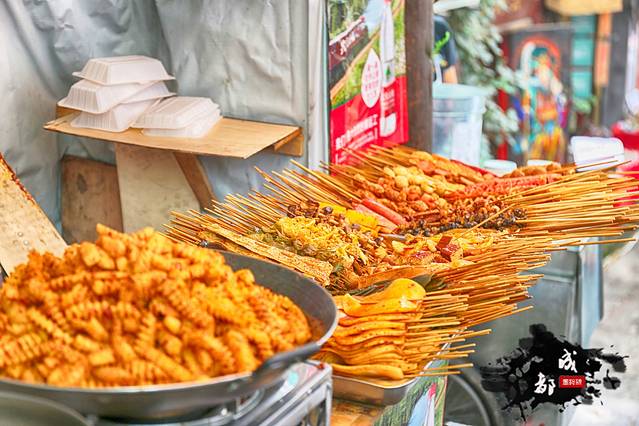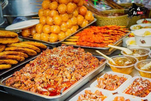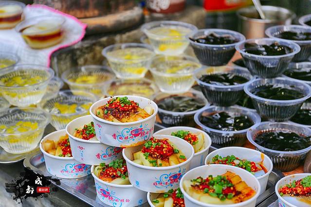 宽窄巷子里的美食,麻辣伤心凉粉,麻辣肉串,几乎所有食物都不会与辣椒分开,所有食物都有红色点缀。