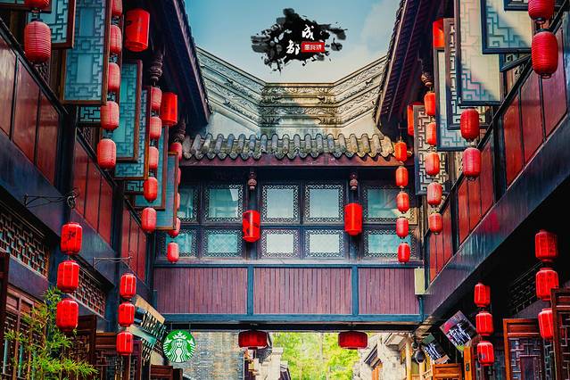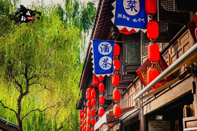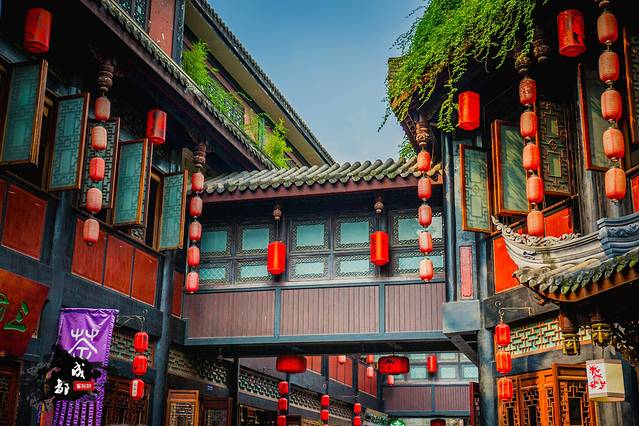 可以说红灯笼与旧客栈式的建筑是锦里的标志,一进门的商铺还有变脸川剧观看,有兴趣的话可以去瞧瞧。
