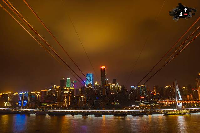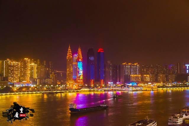 航行的船只悠悠驶过,江两边林立的高楼大厦霓虹灯闪闪发光,倒影在水里。也许晚上的重庆没有白天看起来那么大雾