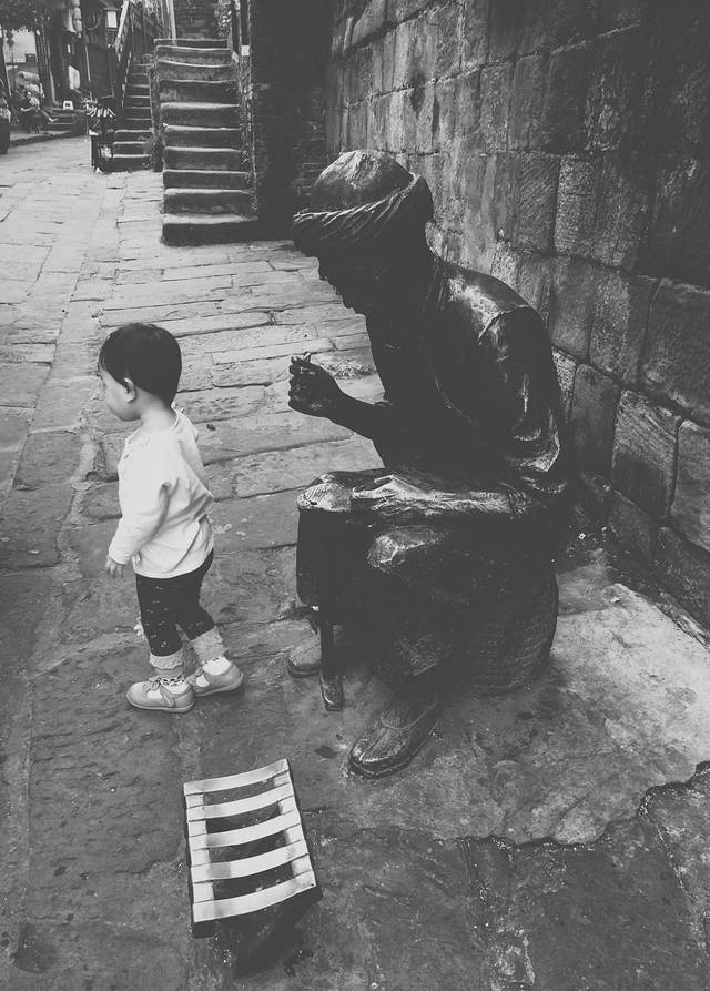 在磁器口一位小朋友与铜雕合影,被父母喊走。