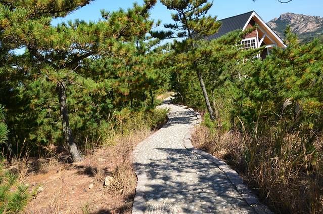 曲径通幽处,顺着鹅卵石小路向山顶进发,有几座小木屋,山顶的风景很是让人期待。