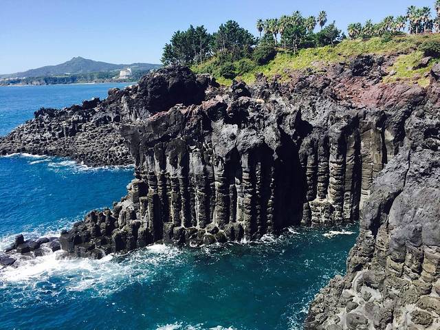 从中文旅游区走到了柱状节理带,大概40min,因为天气好,行程也不是很紧张,就一路拍照就溜达去了。这里的柱状节理带是汉拿山喷出的熔岩流入中文旅游区前海时冷却而成的。