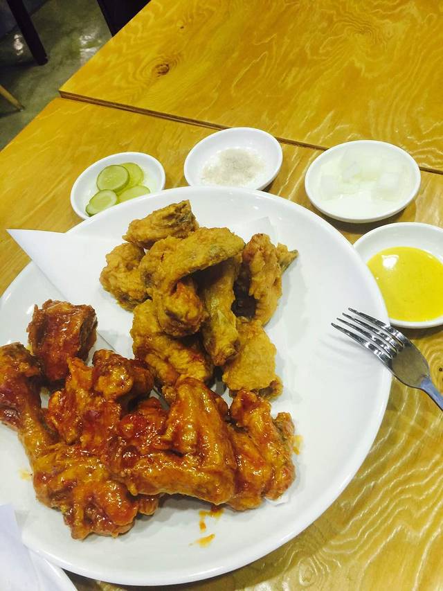 逛了一圈准备回酒店,路过一家炸鸡店看人不少,就点了一份。真的是好吃到没朋友!!!!对了,不管吃烤肉炸鸡还是海鲜,总会有很多小菜,还是有点点吃不惯腌萝卜之类的腌菜==