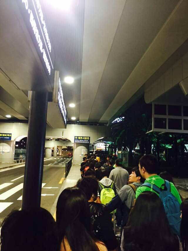 将近凌晨,机场等车的人非常多,但出租不多,等了近一小时才轮到我们。因为赶上国庆假期,大部分都是中国游客。ps,大家一定要在机场拿济州岛地图哦,韩文中文英文三种,上面有主要旅游地点和主要公交路线,之后几天全靠这三份地图问路啦~