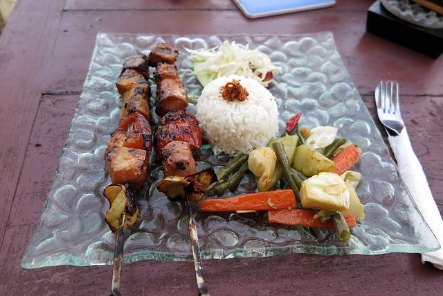 鸡肉》50K到100K》本来最抱有期望的菜,对于任何一个餐饮店来说鸡肉几乎就是评判标准了,一般鸡肉弄的好吃的店都不差,可是巴厘岛的鸡肉餐让我大跌眼镜。。。他们貌似是不先腌制的,不论是烤的、烧的、煮的、炒饭的肉质都很死。。。所以个人不推荐。我真的是以身试法啊,沙爹鸡肉、鸡肉咖喱、鸡肉炒饭、鸡肉BBQ我全都尝试了一遍(有的是点错了单。。。)全都不好吃,一点都不嫩。。。也许他们喜欢吃的吧。。。