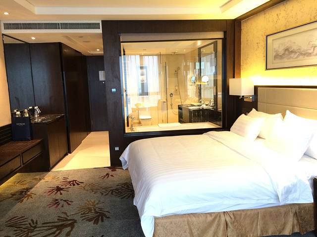 浴缸的旁边的玻璃墙加卷帘设计,应该是很多同星际酒店都会采用的以增强整个入住的开阔性的设计,但这个倒不是常规的布艺卷帘,而是电动的,比较方便;