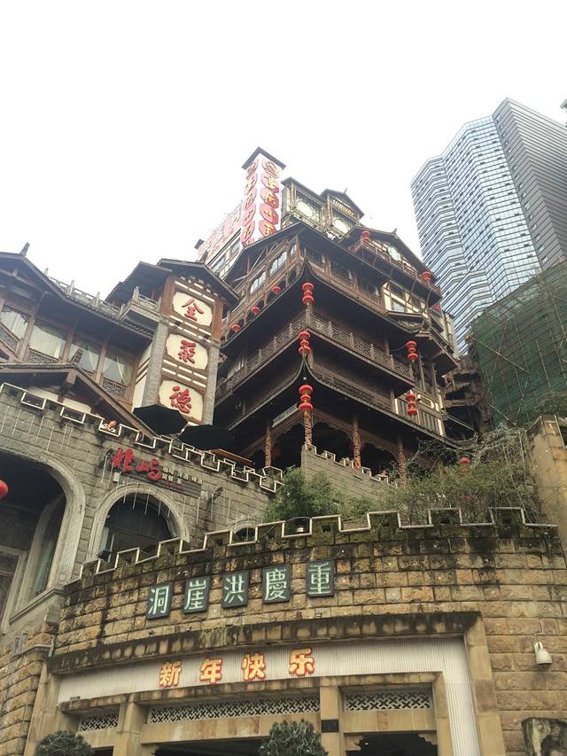 洪崖洞是感受山城的最佳地点,传说中的“从一楼进去,坐了七八层电梯下去,居然又在三楼了”就在此地。洪崖洞是一群依傍于江边山上的建筑,每一层的店铺都有分类。
