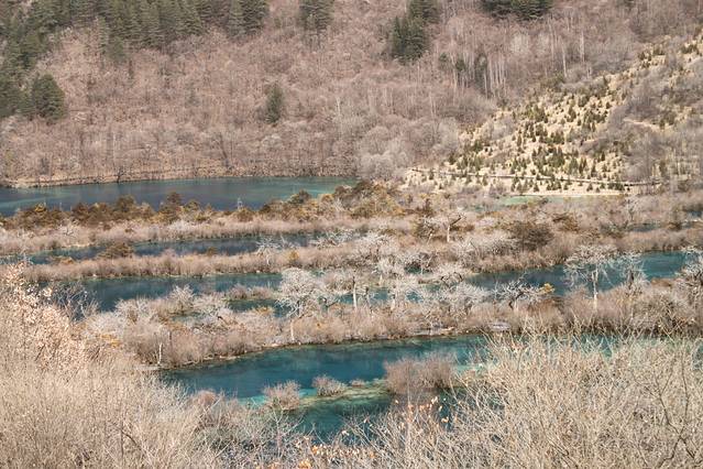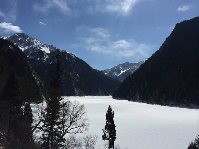 在Y的交叉点诺日朗中心站坐车去往左边的最高点长海,3月份的长海还是冰封的另一种风景。再一站一站下行直至出沟。这条线除了欣赏各式各样的海子之外,还有几处藏寨。