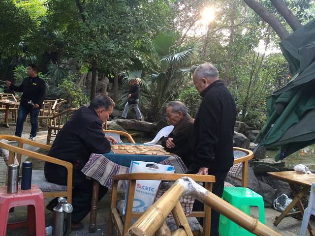 头一天来人民公园是晚上,所有的茶馆都关门了,下午再来的时候,场面相当壮观,无数张竹椅、茶桌都坐满了人,喝茶、聊天、打牌、下棋、发呆,一下子就想到一句四川话:好安逸。
