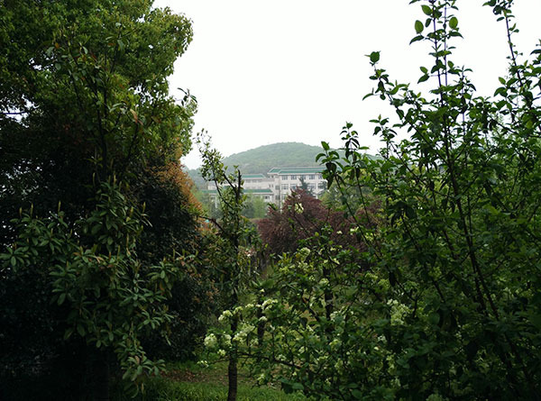 远处不知道是什么山,应该就是珞珈山了吧!武汉大学依山傍水,地理位置十分优越。深深的感觉能在武大上大学是一种十分惬意的事。向四周望去,可以看到满眼的树,而武大一个个的建筑就坐落在这些树木之间,优雅惬意!