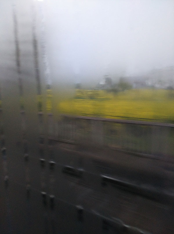 车窗外面是油菜花田,金黄的颜色不停地在车窗外闪过,美丽诱人。这是在中国北方很少能看见的景象。