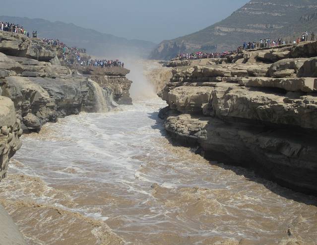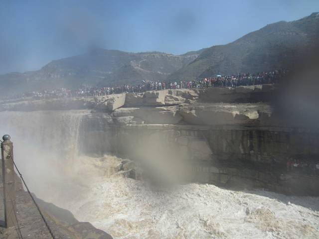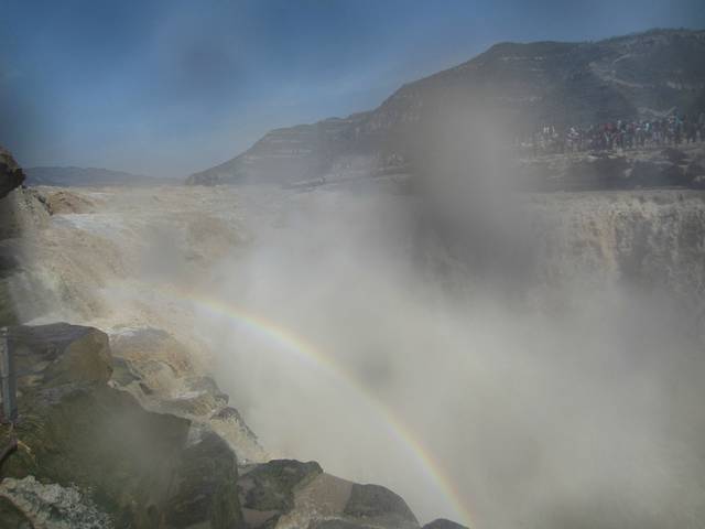 进大门不远便听到隆隆的水声,循着声音往前走,远远的看见黄河水,心情顿时激动起来。到了眼前,不禁被黄河的气势震撼到了,惊涛骇浪扑面而来,咆哮的河水夹杂着泥沙搏斗着冲向那唯一的出口,浊浪排空的场面令人震撼。赶紧拿出相机拍照,留下这让人心动的景象。告别壶口,乘原车回到延安。