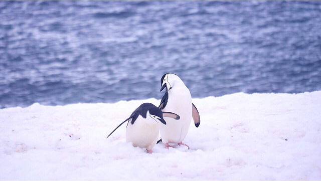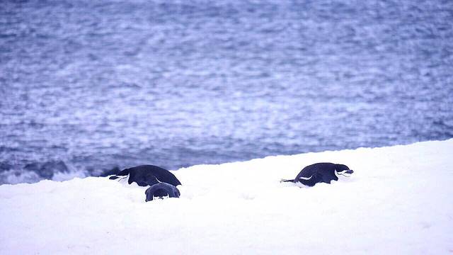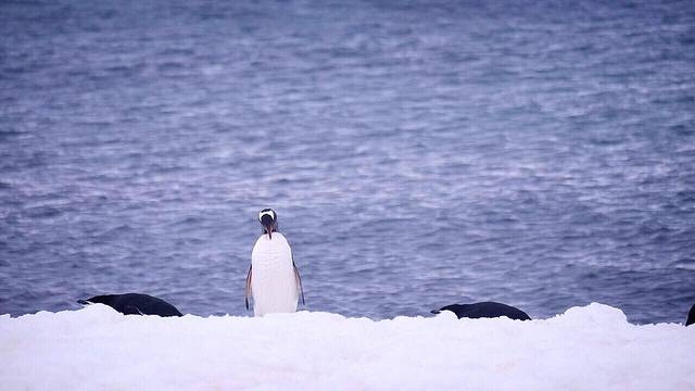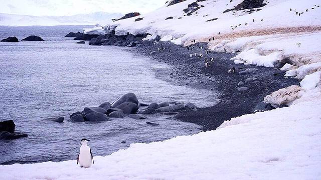 半月岛是帽带企鹅的栖息地 在帽带中 偶然发现一只搞不清方向的巴布亚企鹅混迹其间
