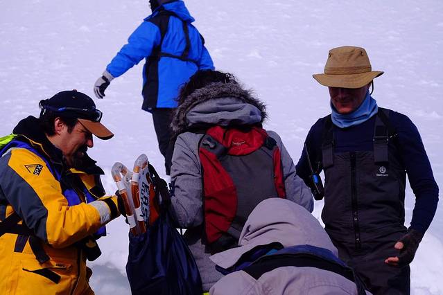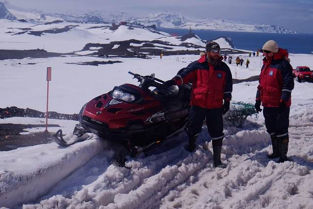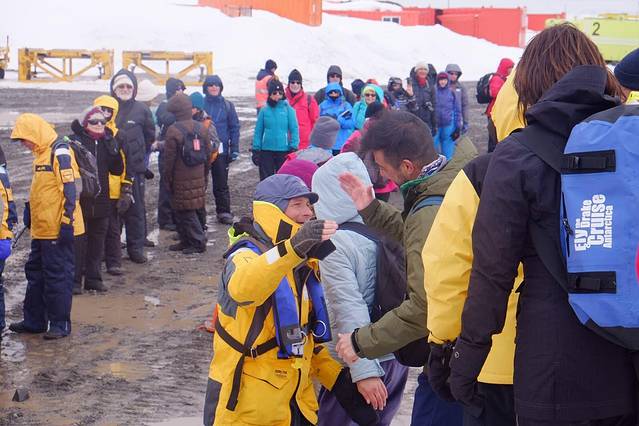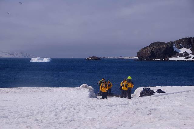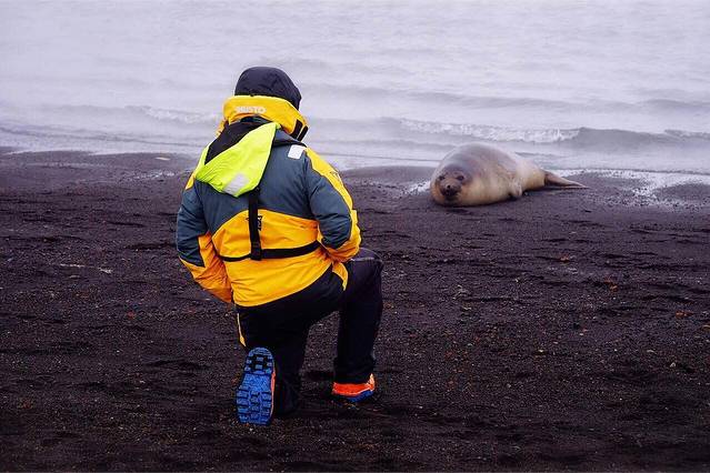 冲锋艇靠岸时 由探险队员告诉大家登陆后的路径 以及最后一班冲锋艇的回程时间 大家尽量沿着探险队标记的红旗走 不逾越红色旗帜标示的安全范围 在每条道路的尽头或海豹休息的区域 都有探险队员站岗 离船和回船要严格遵守登记备案制度 确保每一个登陆的人安全返回船舱