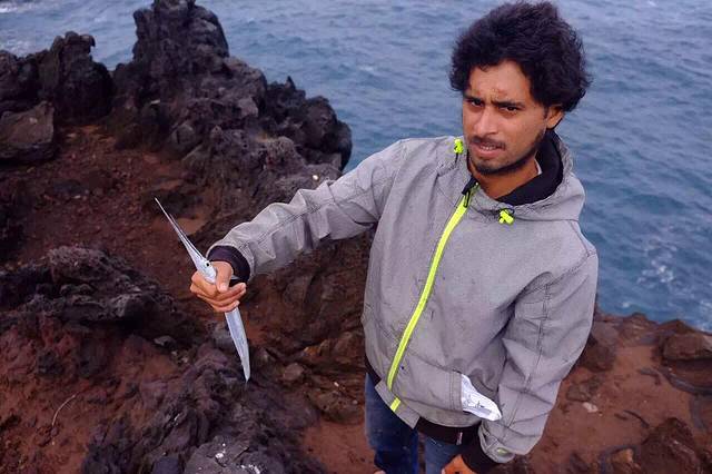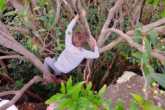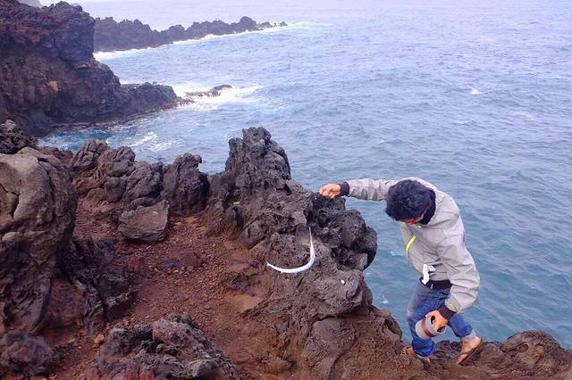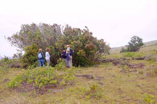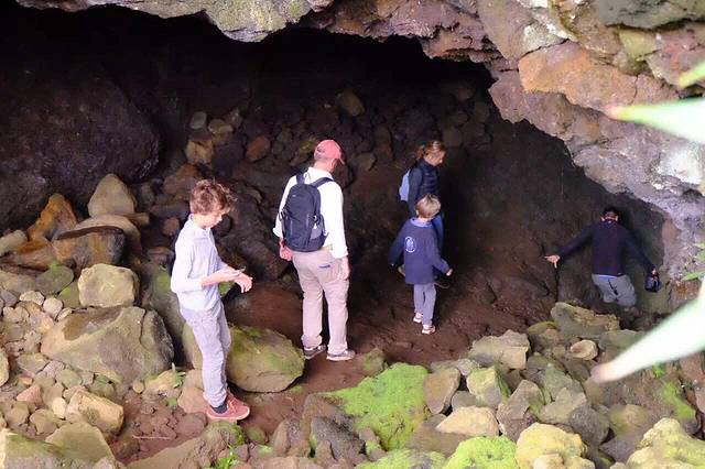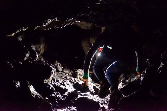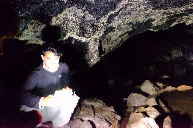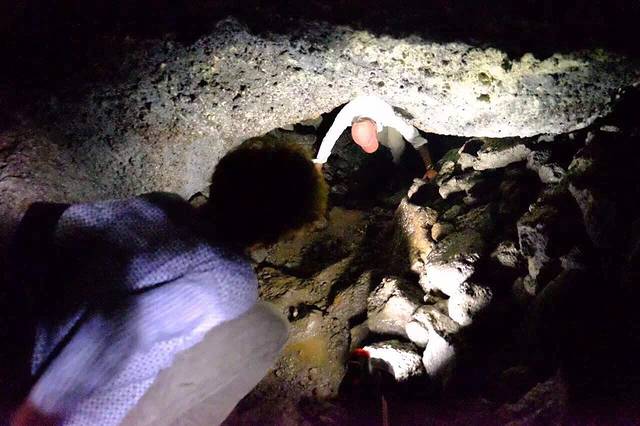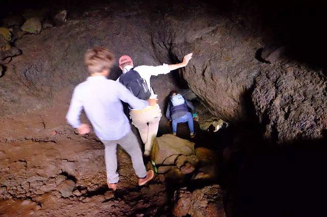 听房东说 在Ahu Akivi的附近 有一条小路 通往一个神秘的地下洞穴 是古代玻里尼西亚人躲避战祸建造的避难所 凭着房东的只言片语 涂了一张搞不清方向的手工地图 以及一点点运气(居然遇到了一家四口带着向导来这个洞穴)我也摸进洞里去啦…洞口非常隐蔽 平地上看是一棵树 (如图一)顺着树干往下爬 落到洞底才发现里面的洞穴 洞穴口狭小 通道只能把全身3折以后 才能勉强进入 洞里漆黑一片 听得见水声 借着手电筒一看 过不去了 向导说 以前水位不高 还可以过去 里面有古人生活的遗迹 …看不见也没有遗憾 今天 我不是已经走在古代玻里尼西亚人避险的路上了吗 ?