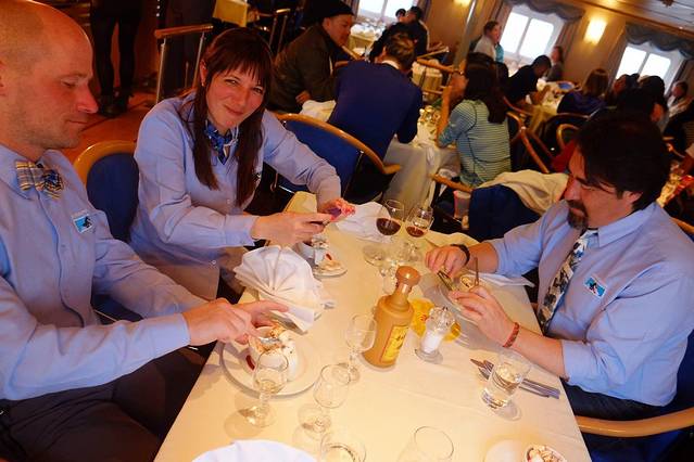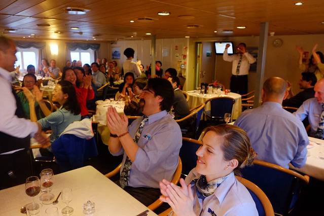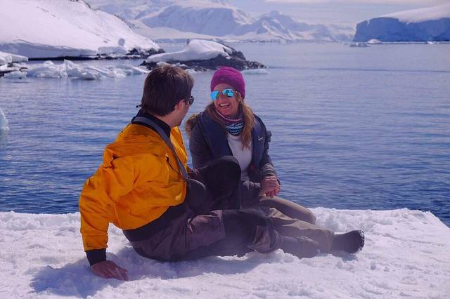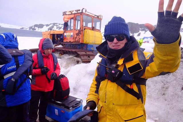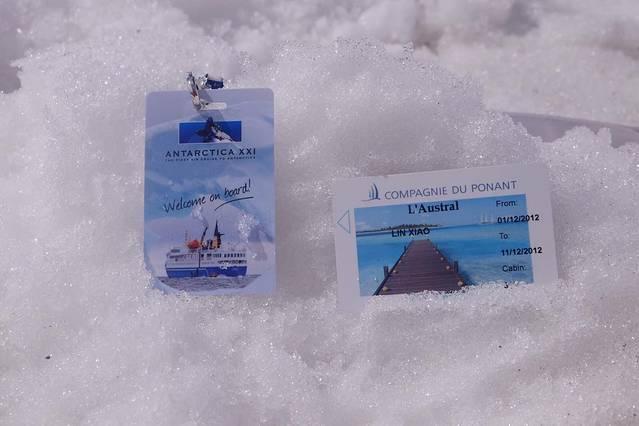 如果不是亲眼看见 我都不相信那些PPT上的海豹 企鹅 鲸鱼居然是Jamie一笔一笔在电脑上画出来的 而不是照片 大概因为第一天上船风浪很大 只有我一个客人留在甲板上和他一起随波逐流的缘故 Jamie每次遇到我都会热情地用中英文和我打招呼 “My dear 你好漂亮!”
