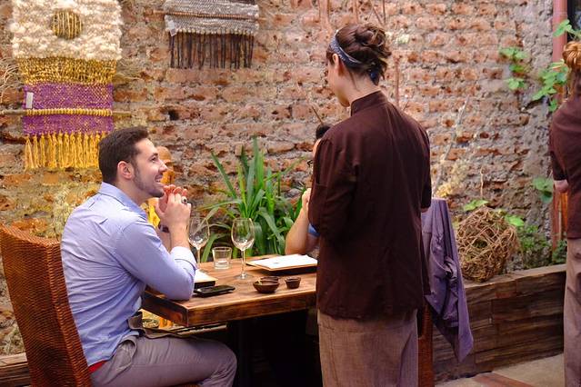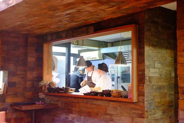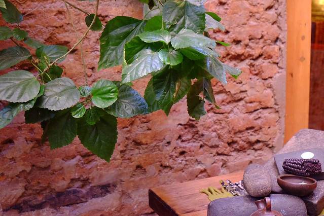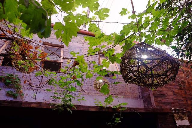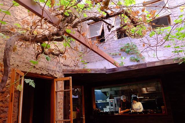 裸露的红砖墙上爬着衰败的枯藤 偶有新发的嫩叶 随意搁置的原木圆石 恰到好处 食物盛器是曾经的街石切割而成 开放厨房里工作人员干净清爽的打扮 利落地操作 …一切 看似无心 实则另一种用心