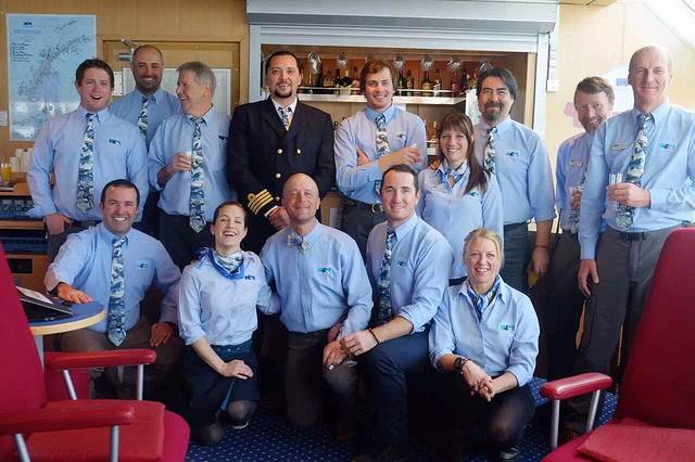 Ocean Nova上的探险队 他们以船为家 常年绕着地球两端航行 是两极地理及动植物研究的专家 从后排到前排 从左到右 依次为mike.Pablo, Sergio, Captain Barrios, Nico, Augustina, Willy, Nigel, Snowy, Mariano, Loli, Jamie, Ben, Pernille