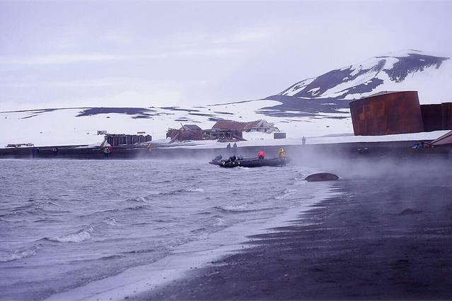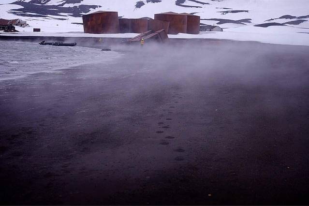 站在Deception Island 实际就是站在冒烟的活火山口 南极的寒风与地底下冒出的热量交汇 在地表形成白茫茫的水汽 40年前的一场火山喷发 覆盖了捕鲸站 这里已经全然废弃 成为南极旅行的必经之地 如果不起风 这里还是南极的海滨浴场 今天风大 只有3个人下水 …