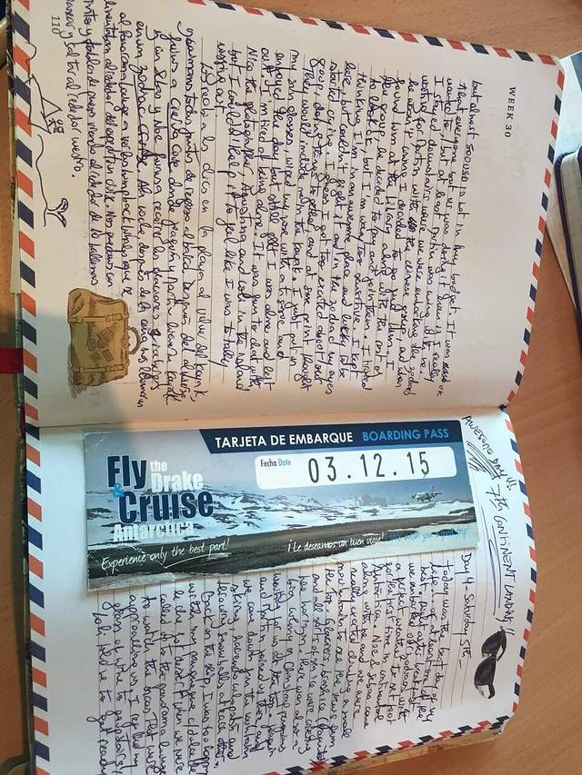 Nico和Marina 是我的Modle Nico是来拍摄南极风光纪录片的 而Marina则从事酒店管理工作 她曾经花了半年时间从南美出发 经俄罗斯 中亚 到达过中国及东南亚国家 然后由北非回到南美 途经30多个国家及地区 她的旅行日记已经有20多本了 每一页都亲笔记录 把沿途收集的票据 图片黏贴在本子上 我也拿出手机和她分享旅行经历 她也唏嘘 嗨 你是摄影师 我说在中国 人人都是摄影师