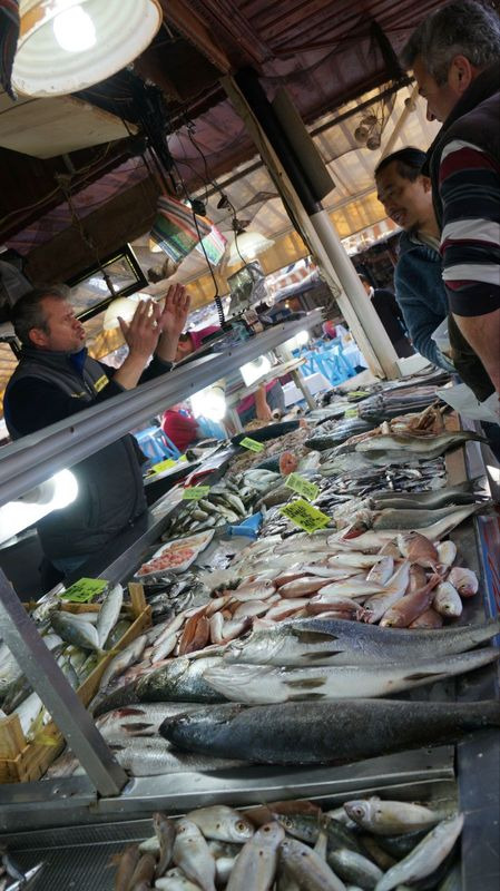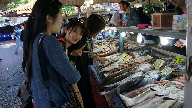 鱼市不大,中间一圈卖鱼的,你挑好可以随便在外面找一家饭店坐下,会帮你烧好,只要付8TL/人的烧菜费的样子