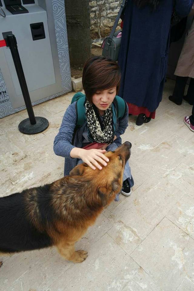 排队买票中,宫殿门口的一只大德牧,很温顺