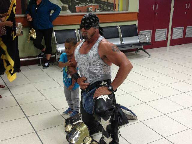 机场偶遇最近一期的WWC冠军,小孩在和他合影,感觉有一米八几的个字吧,却是很壮