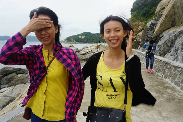 风很大,两妹子这么瘦,已快被吹飞,台风天和冷天不适合来这里耍