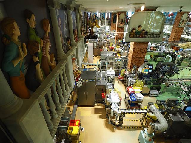 走进公园,会看到一栋像童话城堡的红砖大楼,里面就是巧克力工厂了。外头有一座活动人偶钟塔,每到整点会有“巧克力嘉年华”,钟塔上的人偶开始唱歌跳舞,非常欢乐。