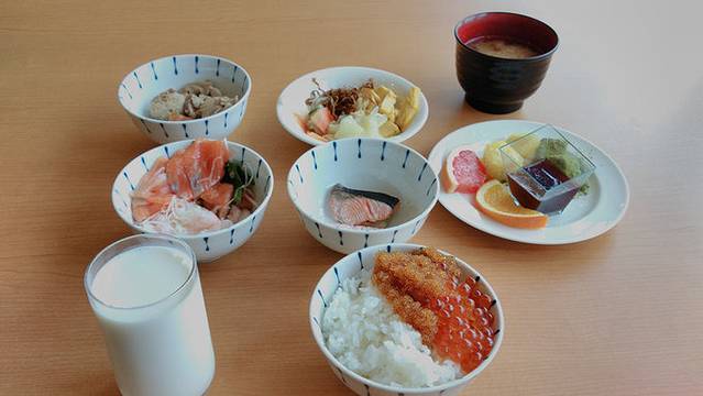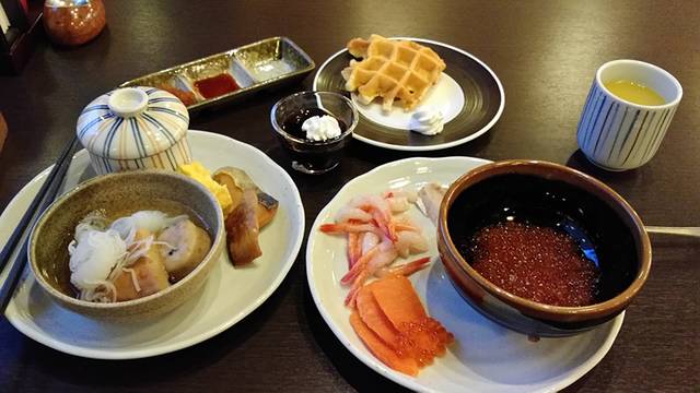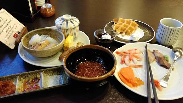酒店早上的早餐是可选付费的,1500日元,真心不错,鲑鱼籽和海胆都有,还有北极虾等三文鱼,品种丰富,值得推荐。