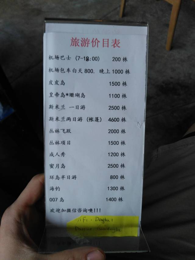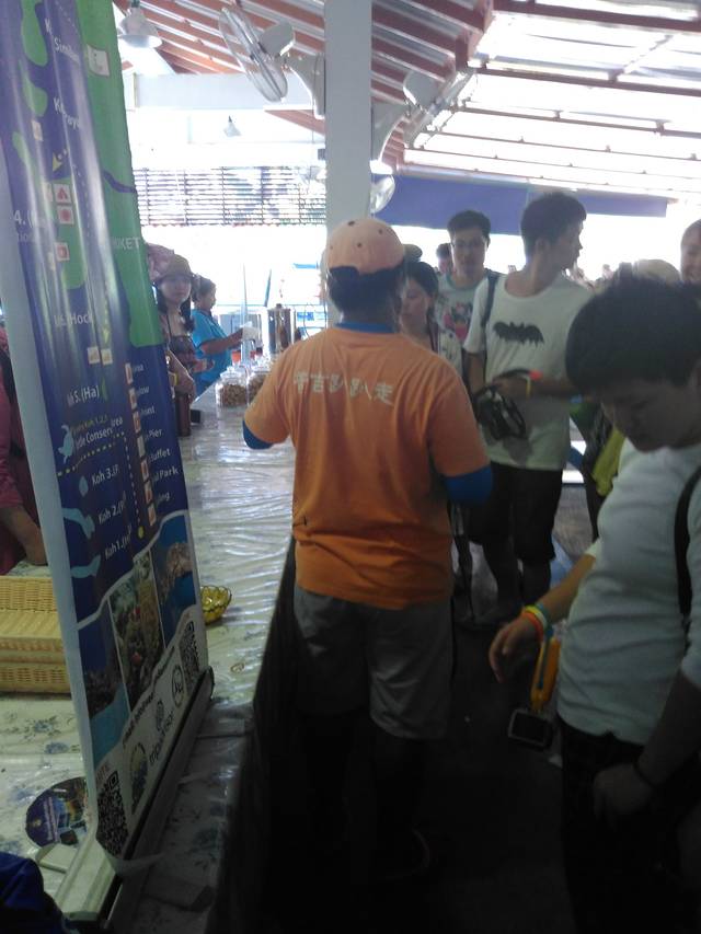 当地旅游项目预订:根据你自己的喜好,可以在网上预订或者到当地再预订,事实证明两种方式的都很方便,游玩质量的差别在于价钱,像我第一天预订的PP岛一日游,350人民币,刚出海船就坏了,然后等了一个早上才能出行(当然这是一个意外,后面会说到);后面两天的斯米兰岛和达柴岛400到500的价格,所坐的船都更宽敞,游玩的时间更充裕,时间分配更合理,好了扯远了,言归正传,预订好了之后,留下酒店地址、酒店名称、酒店号码就行了,你只要记住出行当天的集合时间和地点就行了,一般都是在自家酒店的大堂等候,到预定时间就会有minibus来接客啦,全程接送服务,晚上回来也是送到酒店门口,所以交通方面不必担心。
