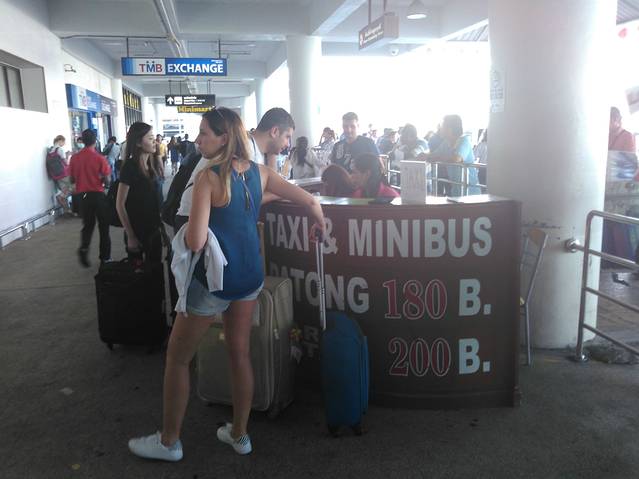 接送机服务:对个人出游来说,根本不必提前在网上预订,因为出了机场的门口就有很多minibus,它们都是同一家公司的,在小柜台那里出示你的酒店名称和酒店地址,然后工作人员就会根据你住的远近来判断车费,像我住在芭东海滩,车费也就180 B,比在网上预订的便宜多了,送机的服务的话,根据起飞时间还是比较有必要的,因为minibus营业时间是从早上7点到晚上7点,如果你的起飞时间不在这段时间内的话,对不起,就没有minibus坐了,只能租车也就是taxi服务(全天候服务),这个会相对贵一些,听说要到600B左右,由于我的起飞时间是早上8点多,但是在我老乡的带领下,在当地的一个旅游小柜台里软磨硬泡了半天,刚好有一个顾客是晚上4点钟的飞机,他们2点多从酒店出发,然后我就蹭上他们的车,悲催的在机场度过了一个晚上。。。不过总算没有错过飞机