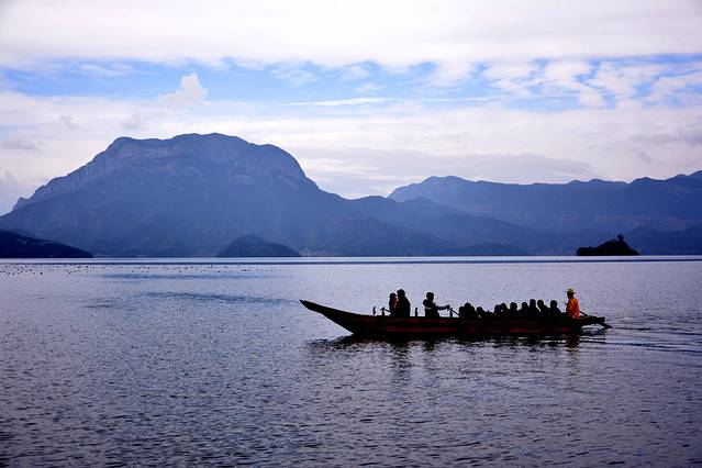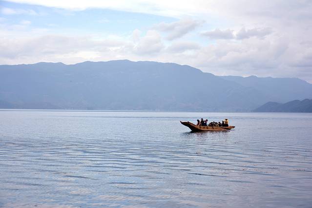 傍晚的泸沽湖上,多云,有那么几艘小木船。