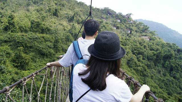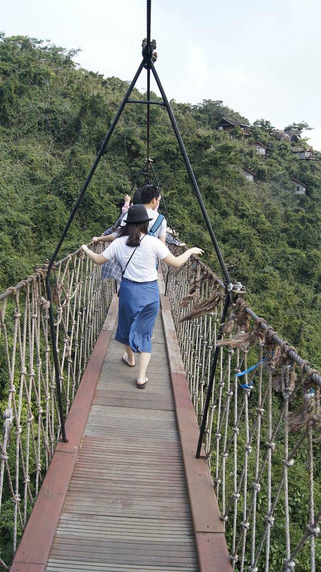 在桥上拍的照片,当时的情景是桥一直再晃,前方的璇妹子一直回过头来叫我:小明,快跟上来。在我后面的男生一直和我说:美女美女快回过头来,我在拍小视屏啊!快回过头来。哈哈哈哈我内心真实的独白是桥一直在晃,等一下我会不会掉下去啊!