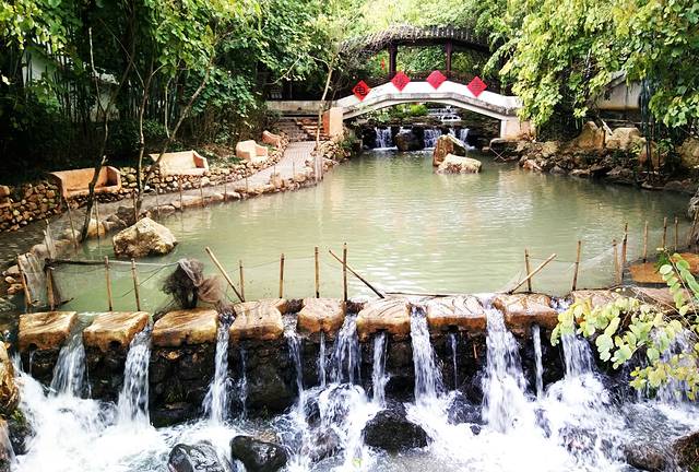 到的时候刚好能吃饭,我们就先在一家农家饭店解决了午饭问题。吃完午饭在农家乐那边玩了一会在出发向佛冈金龟泉温泉度假村,大概下午3点多才到,整个温泉度假村依山沿江而建,环境清幽,典型江苏园林风格,这是通往温泉的“金龟”桥。