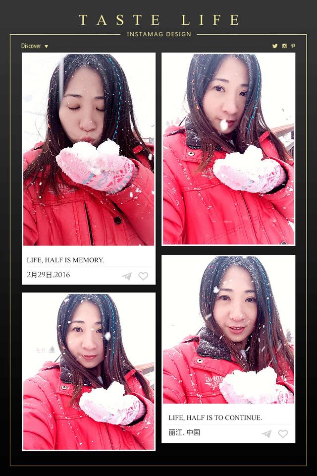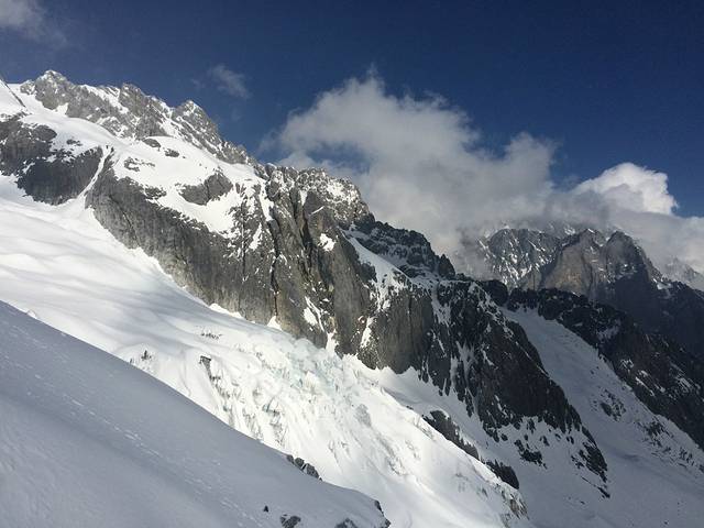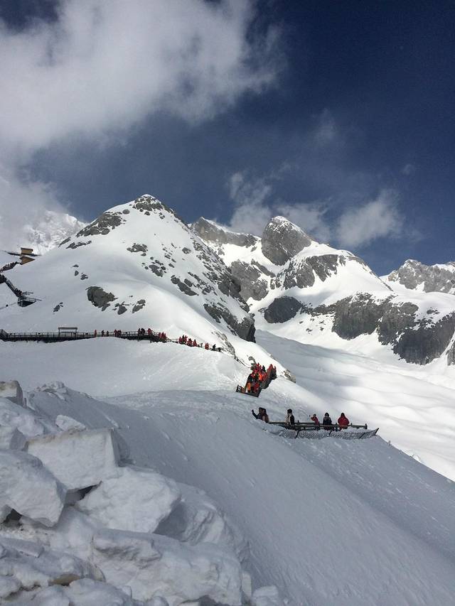 在雪山上拍照绝对是需要勇气的,一脱手套手就冻僵了,绝对是冻僵了!为了拍照,冻算个啥呢!!拍拍拍,雪花那个飘啊飘啊!!也许是上大索道吸氧了,没有出现多大的高原反应,一直处于亢奋的状态中!地导说身体好的人会有高原反应,身体差的反而不会,这话也不知道是真是假,总而言之我没有多大的高原反应,这雪山爬着一点也不费劲!