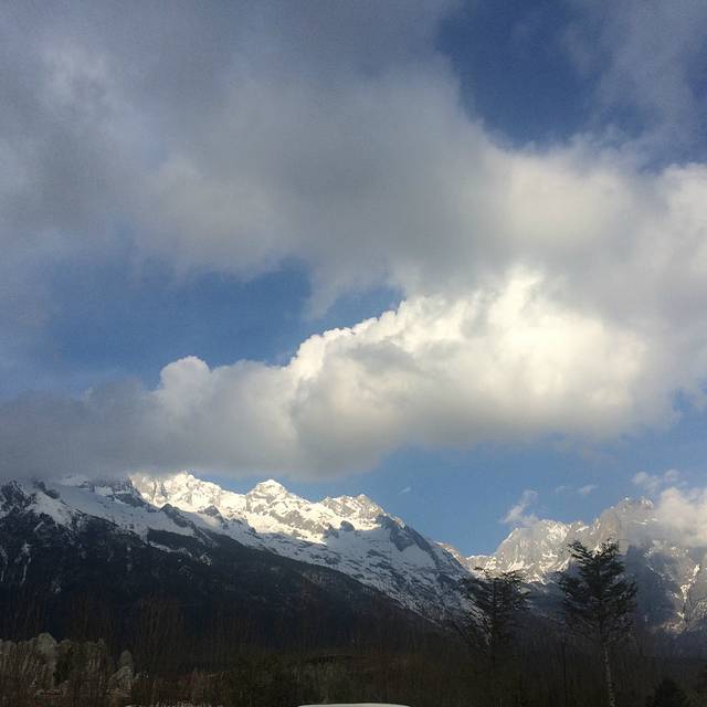 送我们的司机人挺好的,一路上讲解,一路上我们是看着雪山越来越近,越来越近!车子只能停在停车场,到了停车场导游兼司机大叔开始讲解我们要玩的地方及路线,然后带我们到坐雪山巴士的地方就撤了~