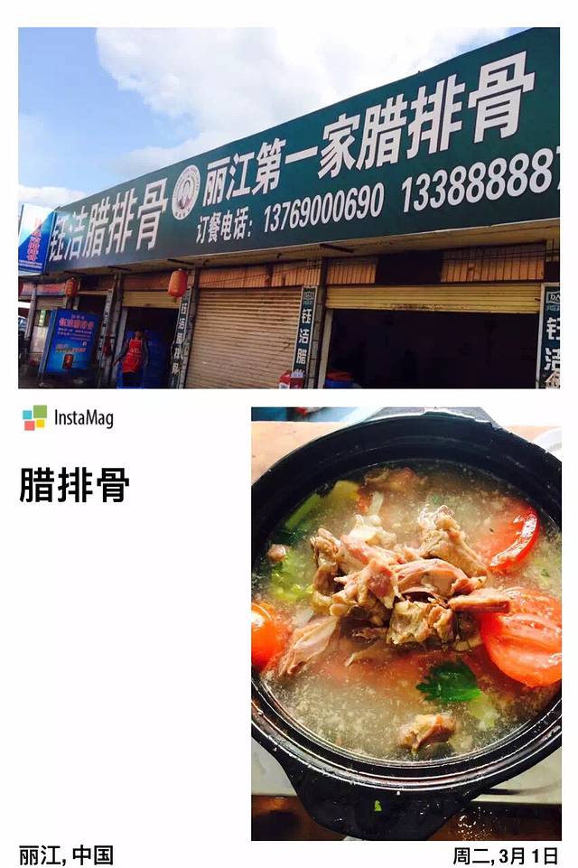 丽江的特色是腊排骨,有人说:到一个地方一定要吃当地的特色菜!特别跑到象山市场去吃了当地评价较高的腊排骨:钰洁腊排骨,味道确实赞!古镇上的比较不正宗,排骨死咸的那种味道!