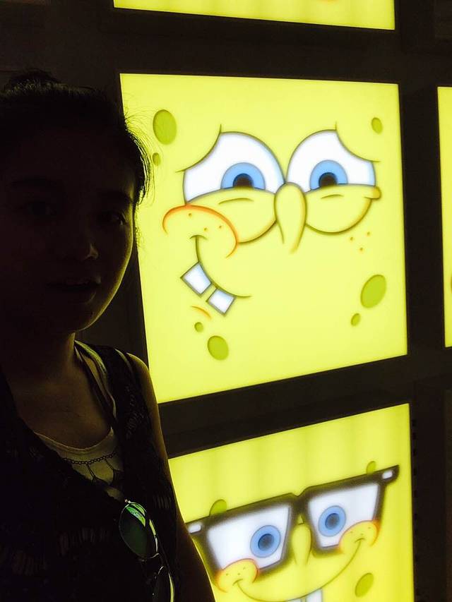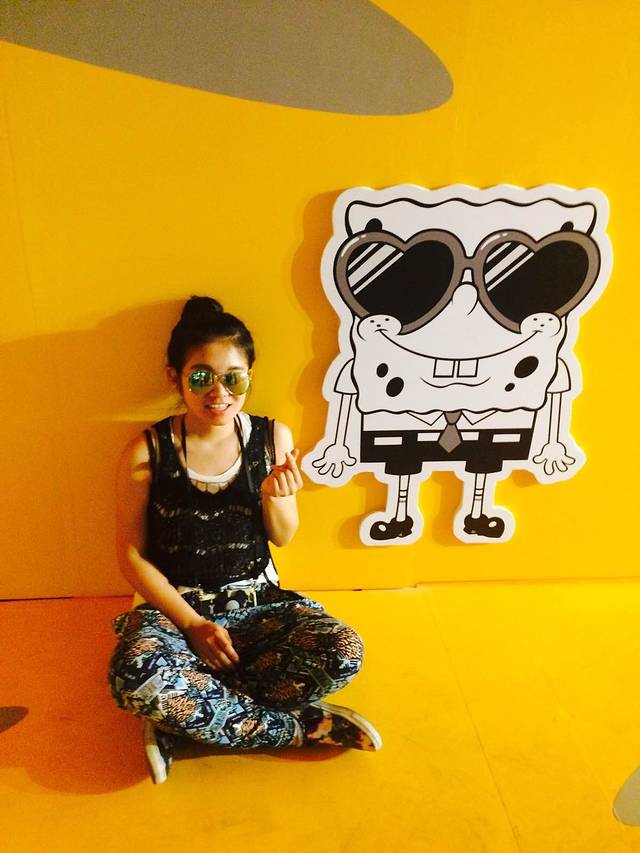 入口上楼,就进入主展馆啦~ 满满的sponge bob的颜色~吼~ 看见墙上写着这个,就念了出来。工作人员愣了下,以为在跟她说,居然还应和:嗯,you're famous,