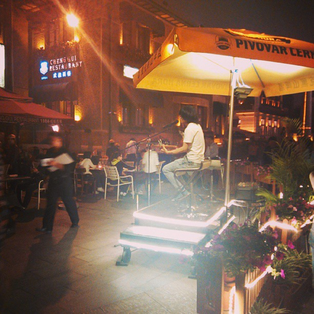 很多店里都有歌手在驻场,灯光,音乐,美食,人流,好不热闹