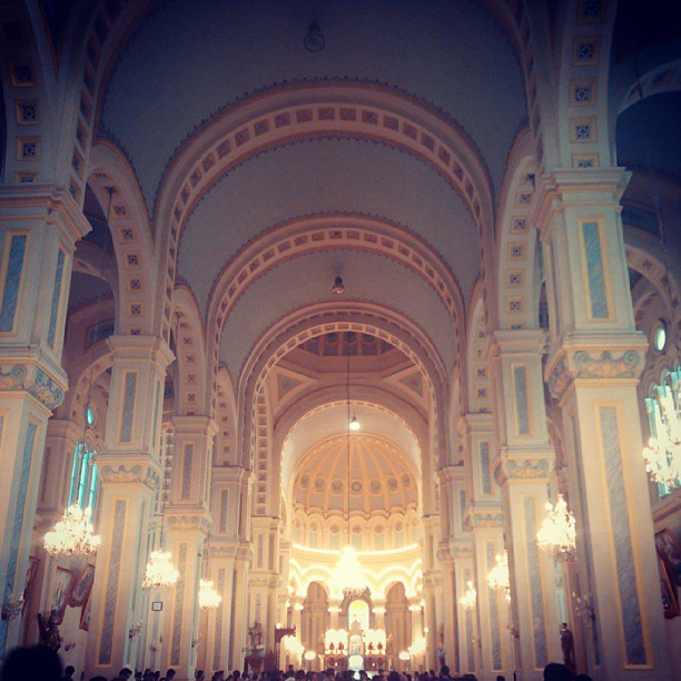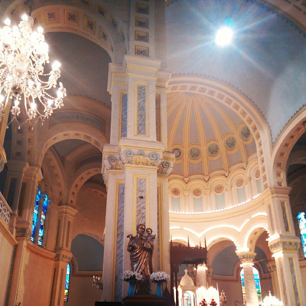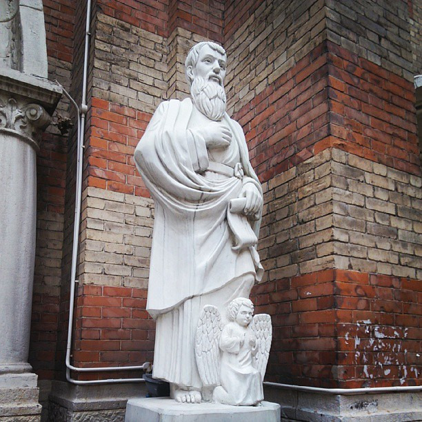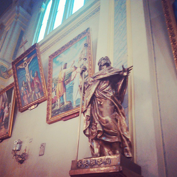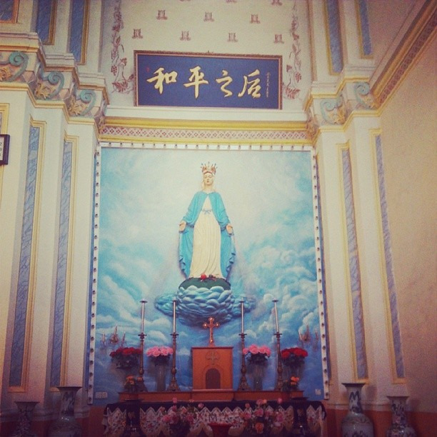 教堂外围是红黄花砖相间砌成的自然横条图案,白色的神像,一层一层的拱门设计更是凸显西方色彩