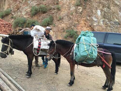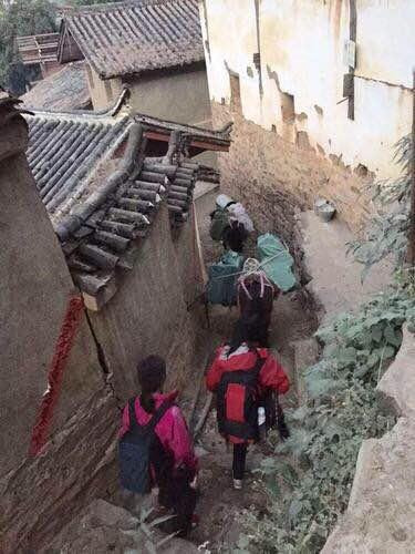 我们从泸沽湖出发,经过七拐八弯的上山下山,再上山下山..........大概是5、6小时的车程到达目的地。行李由马儿驮着下山!
