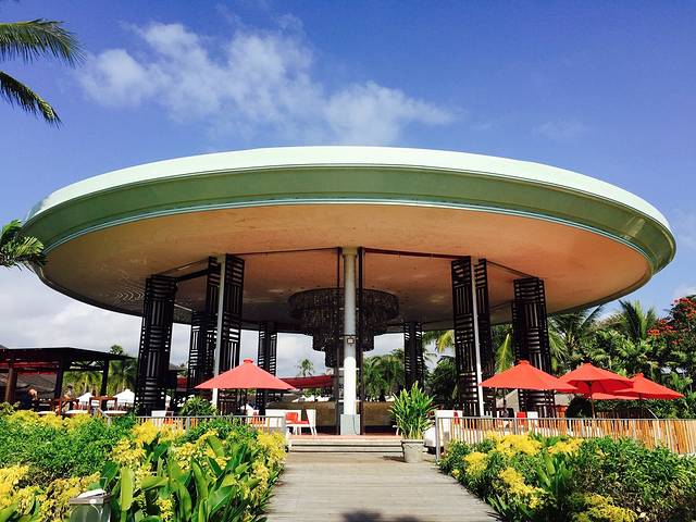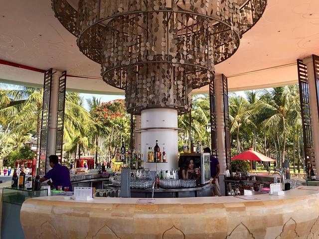 这个圆形的敞开的建筑就是吧台,提供免费的酒水饮料(极少数收费),它面对着游泳池,背后的草坪后面就是大海