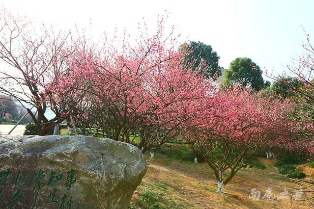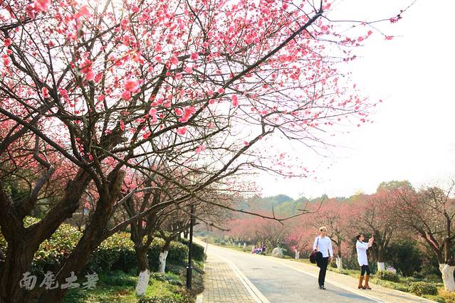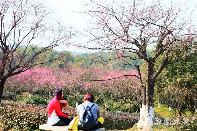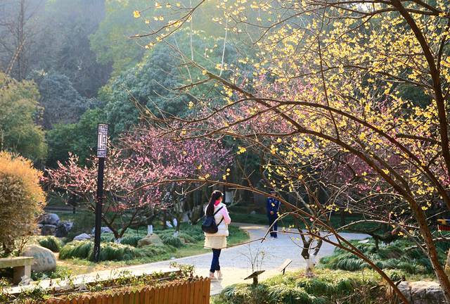 我认为最漂亮的地方是宋梅亭出口处,一棵巨大的黄橙橙的腊梅树王,在远山苍翠的绿意和周围红、白梅花的交相辉映下,色彩斑斓。花下走过,曲径通幽,花飞花落,意味深长。