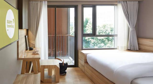 我们的酒店叫Happy 3,坐落于National stadium地铁站附近,我们的房间是日式原木风的,小而精致,阳光透过白色的窗帘洒在大床上,很温暖。房间的大床很大,可以横着睡也可以竖着睡。