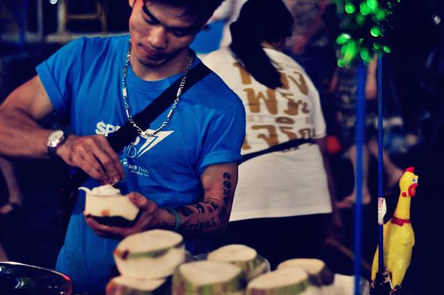 吃完晚餐,我们在考山路闲逛,周围卖的还是那些东西,泰国特色的阔腿裤,比基尼,t恤,友谊绳,还有走两步就有的马杀鸡,扎脏辫,多了近两年流行的hana,还有一家又一家的刺青店