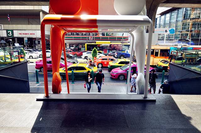 早上睡了个懒觉,开启逛街模式,我们的酒店旁边有一家精致的小店,我在那儿买了好看又便宜的围巾和阔腿裤 ,然后从National stadium坐两站地铁到chit lom, 当时是因为没有经验因为其实是能靠走的,地铁票很贵,就当给爸妈感受一下曼谷的地铁把,从站台出站,从天桥上往下看,看到了色彩斑斓的出租车,两边的商场 似乎还没有开门,当我们踌躇的站在天桥上的地图面前不知道去哪儿时,有一个穿制服的男子迎上来,问我们要去哪儿,我们说我们要去siam paragon,他说商场11点才开门,所以推荐我们去,说是非常赞,并且仅此三天,今天是唯一的半天对游客开放,下午一点就结束了,还热情的给我们画了地图,告诉我们天桥往下向前走就到,反正商场也没有开门,那我们就去看一看吧,反正我喜欢market。