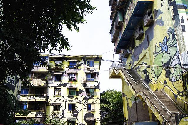 吃过饭,我们选择下午的时候去四川美院的涂鸦一条街。从磁器口并没有直达的车,我们先是做了轻轨后来又转了公交才到达的。