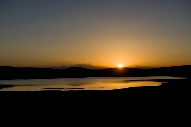 一边是美丽的日出光影,剪影,一边是硕大的月亮还不睡。
